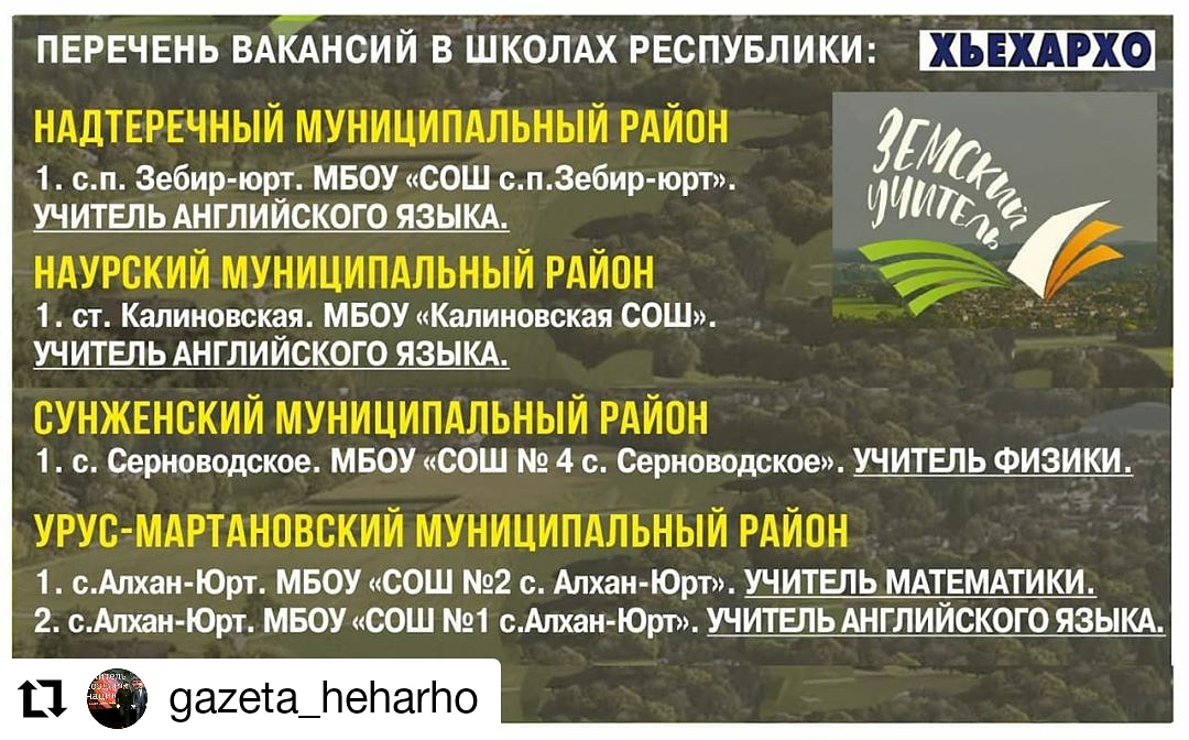 #МОН95 #ЗемскийУчитель #вакансии #учителя #Чечня #газетаХьехархо