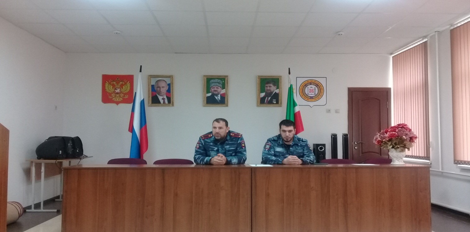На мероприятии присутствовали-заместитель начальника полиции по охране общественного порядка, подполковник полиции- Э.И. Евсултанов, участковый уполномоченный полиции, капитан полиции- А.Ш. Догаев, директор школы- М.У. Сембаева, зам.директора по ВР-И.А.Джамбулатов. В ходе мероприятия использовалась презентация по правилам поведения в случаях, связанных с террористическими актами.