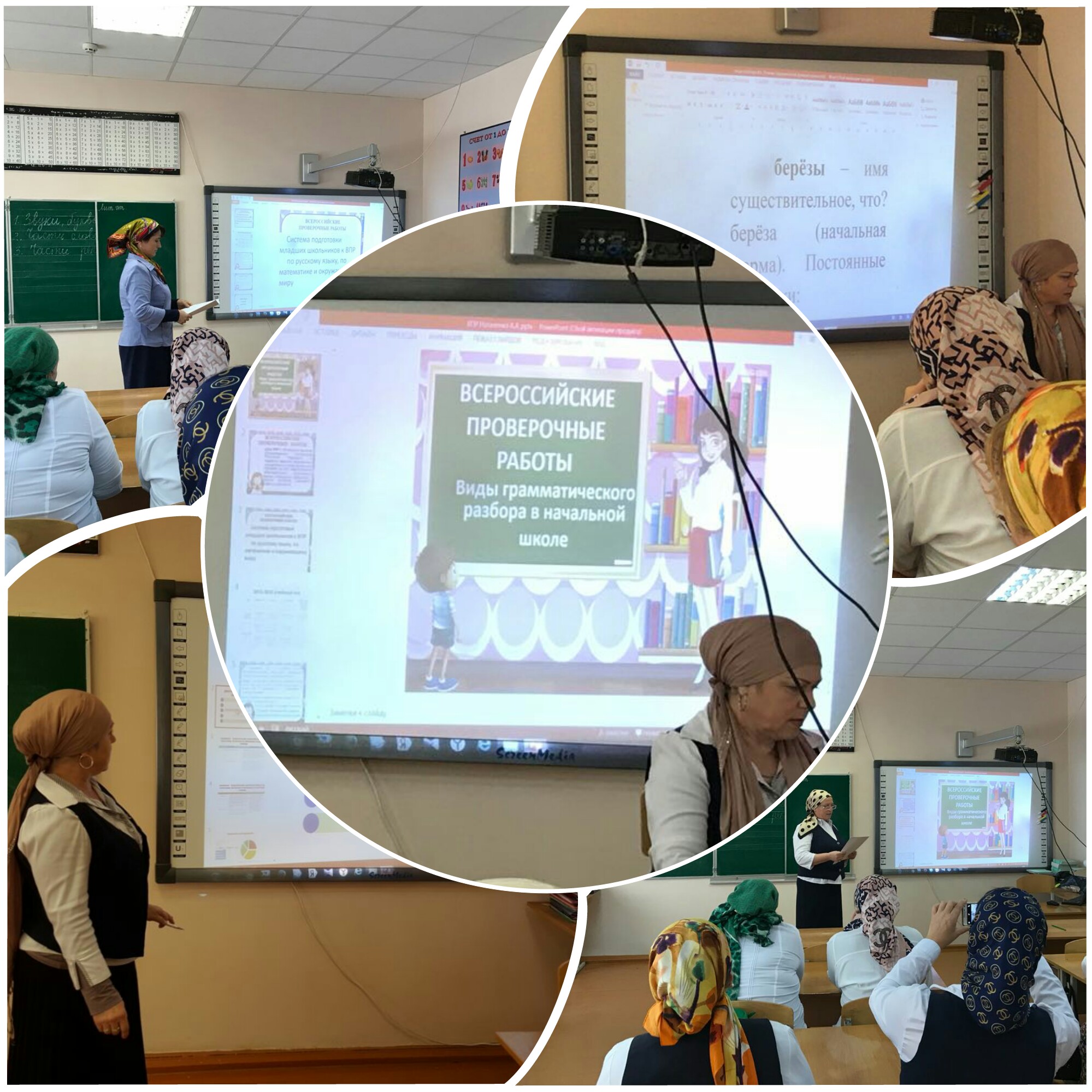 В начальной школе проведени семинар нна тему : "ВПР. Виды грамматического разбора в начальной школе" и "Система подготовки младших школьников к ВПР по русскому языку, по математике и окружаещему миру". Семинар провела заместитель директора по начальным к4лассам Эльдарханова Л.С..