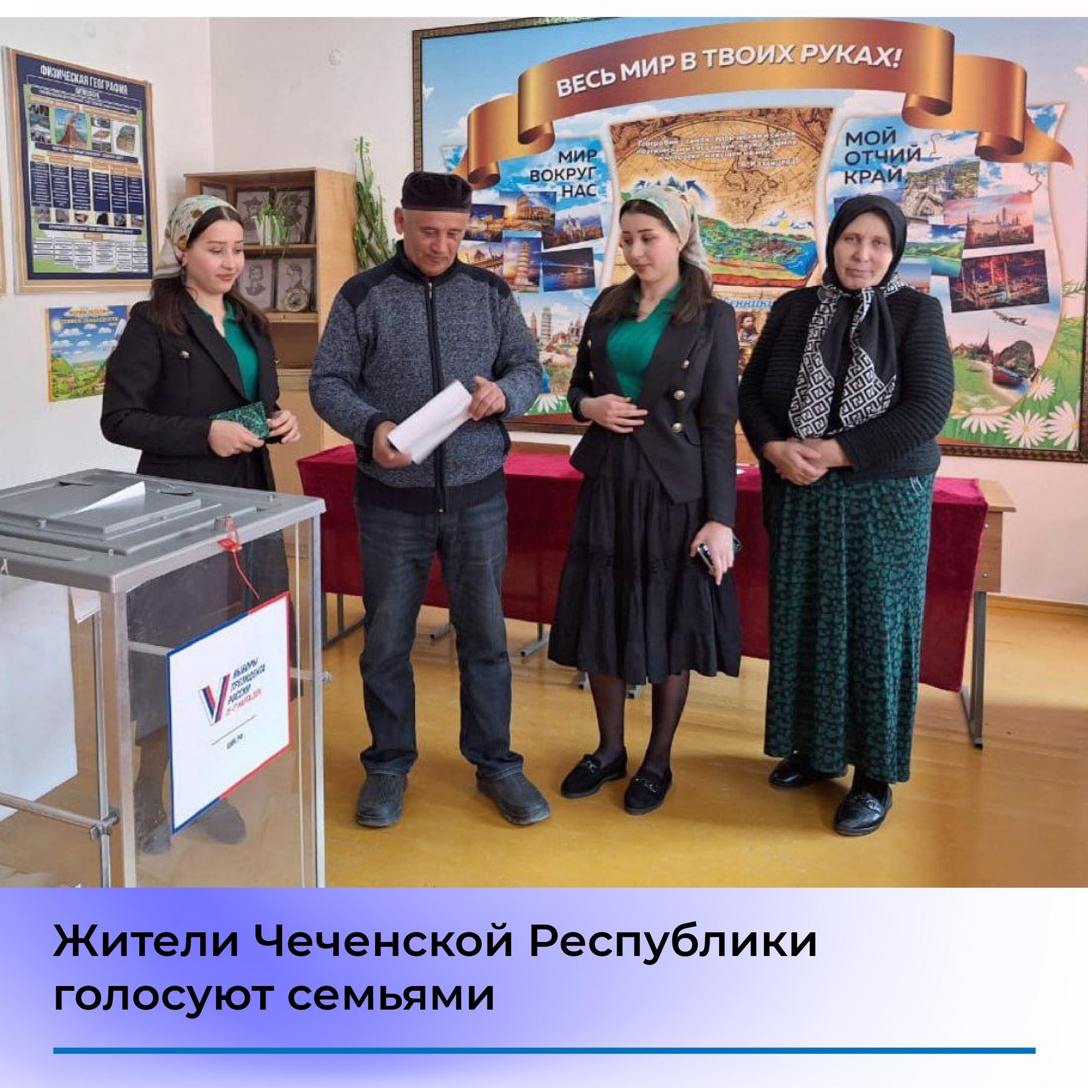 16.03.2024В Чеченской Республике избиратели приходят на участки семьями. Семья Чааровых в числе таких, они решили, что должны вместе принять участие в выборах президента. Дочери вместе с родителями пришли и отдали свой голос за кандидата, которого считают самым достойным. Семьями на избирательные участки в республике приходят чиновники, общественные деятели и рядовые граждане. По итогам первого дня голосования явка избирателей в Чеченской Республике составила более 400 тысяч избирателей.