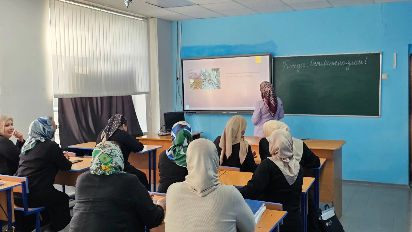 В МБОУ «СОШ 3 с. Гехи им. А-Х. Кадырова» медсестра провела профилактическую беседу с рабочим составом школы на тему: «Первая помощь при укусе змеи» Цель: научить правилам оказания первой помощи при укусе.